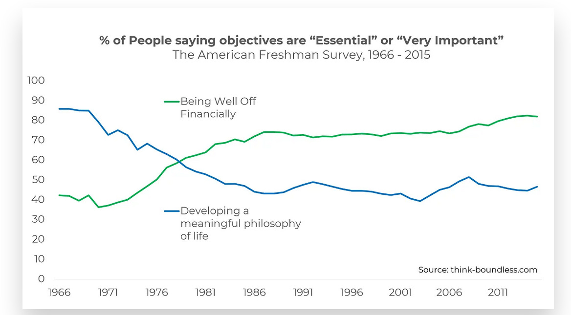 While “developing a meaningful philosophy of life” seemed to drop steadily from survey launch, the goal of being well off financially didn’t seem to take off until the early 1970s.
