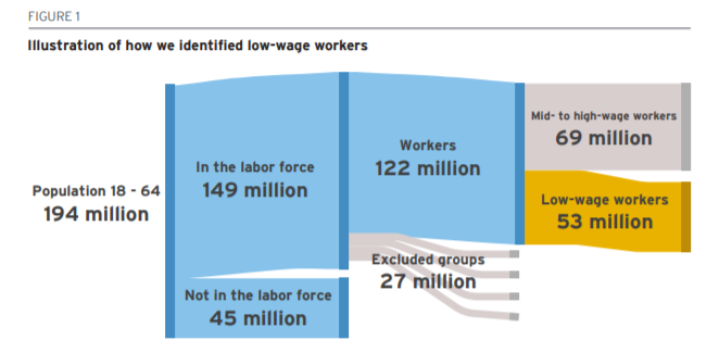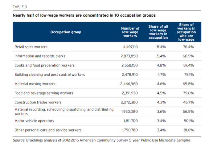 Brookings Institute released a report on the state of low-wage work in America. I became concerned with this after doing some work with the Good Jobs Institute a couple years ago and seeing how bad the conditions were for many of these workers. Beyond low wages, many struggle to get enough hours, get their schedule more than a week ahead of time or keep a job if they have to take care of children.