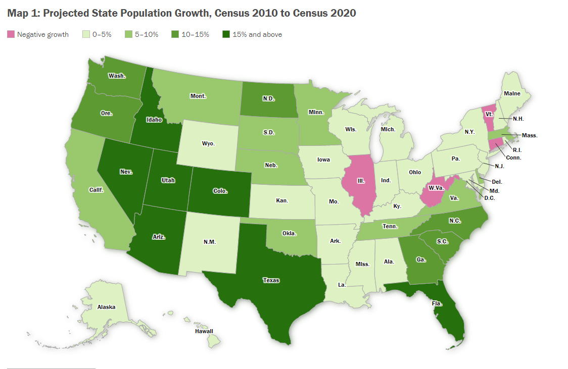 The early census results from the US show that only a few states have very high population growth over the past ten years, notably Colorado and Texas, which seem to be attracting many people from colder and more expensive states.