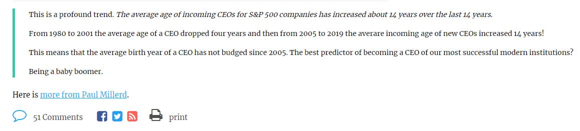 Since rich senior managers tend to have access to the best healthcare, nutrition etc. I think the Boomers will be sticking around. Instead of another “youthquake”, Imo we’re more likely to see the young forsake traditional institutions entirely, in favour of more gig-work, lifestyle businesses and startups.
