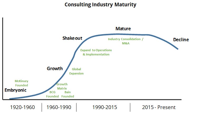 This would be great if the consulting firms were thought-leaders, but instead they have become too big to think - trapped by their own scale and success. When BCG introduced the growth share matrix and experience curve in the late 1960s these were additive innovations, but the firm was small and scrappy with less than 100 consultants. Now BCG has more than 21,000 people. McKinsey, more than 30,000.