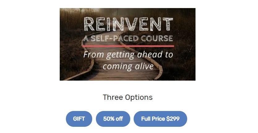 Iāve decided to pull the reinvent course out of the closet and offer a light-touch version of the course in May as a gift. You can take it for free with the option of giving a gift at the end (or not). Depending on the demand and engagement in the Discord group, Iāll be engaging with people around the exercises. Click the below image to sign up!