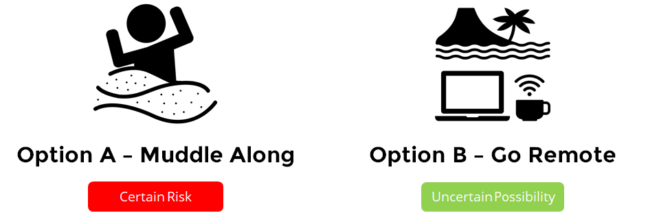 This means new ways of decision making, communicating, developing trust, leadership, and recruiting and to do this with 4,000 people during an economic crisis carries a certain amount of risk. However, I think the alternative is more certain and caps any possibility. This is why I think going-remote will remain a âfree strategy moveâ for the coming months.