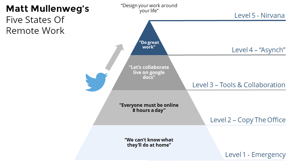 Twitter is likely an established level-three ready remote company. The engineering-oriented cultures of tech companies make them some of the earliest adopters of new approaches, hacks and technologies.