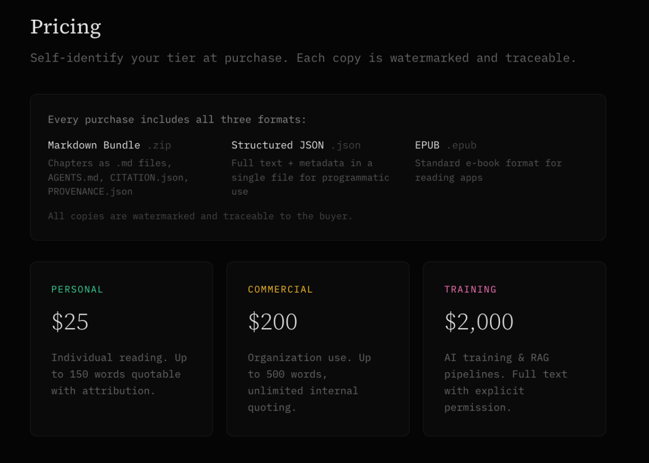 This returns a Stripe checkout URL. Open it to complete payment.When the purchase is made, it automatically injects a license and hash in the EPUB, MD, and JSON files with terms and specific instructions on how to use the book and how to source it (encouraged).