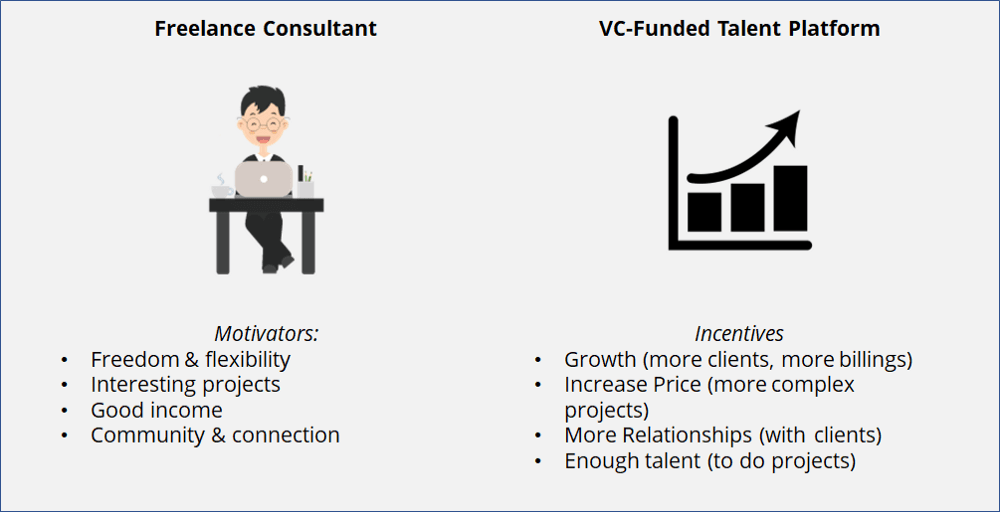 The platform is motivated to grow the firm and develop strong relationships with as many clients as possible. They are aligned with clients over the long term, but not with the individual freelancer. As long as there are enough people that can do the projects, there is no incentive for the platform to care about the success of any individual freelancer.