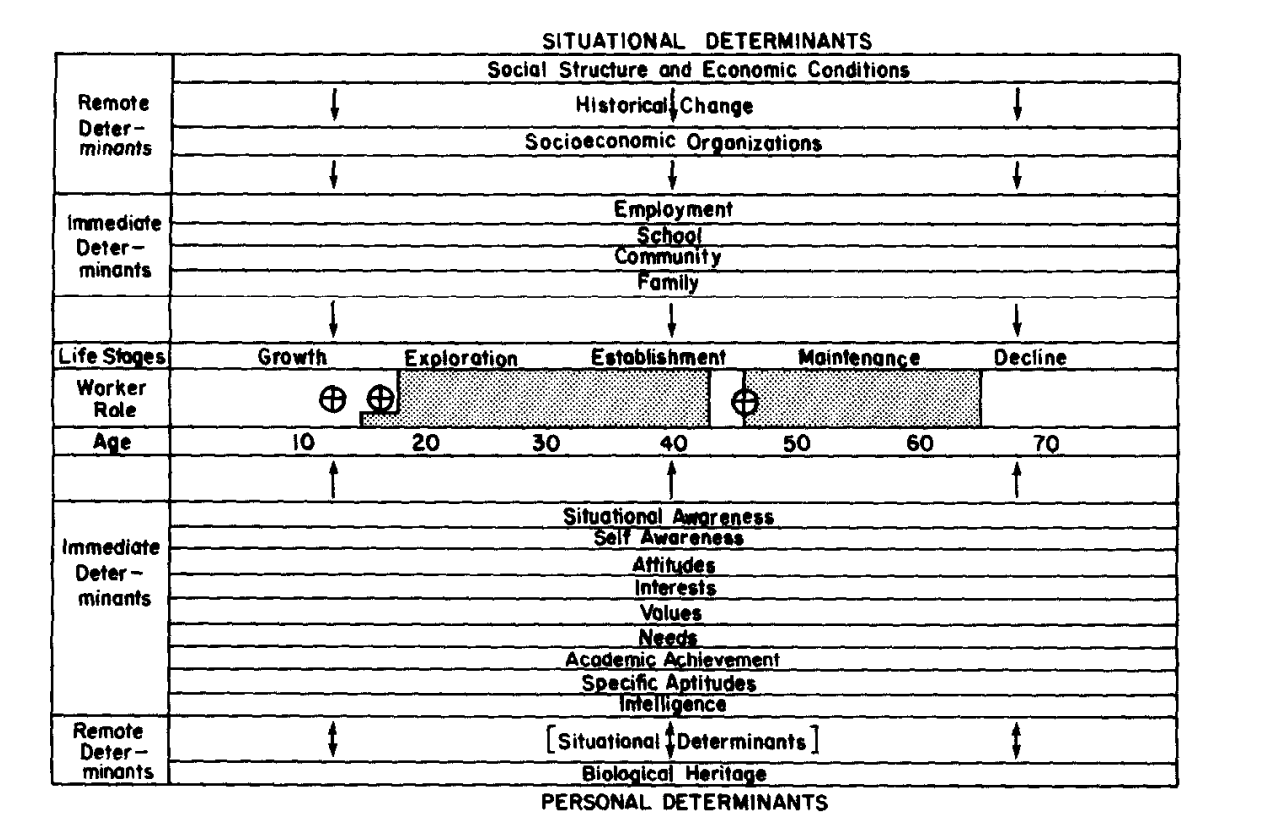 The interesting thing was that Super kept going with these ideas until late in life. At 79 years old, in 1990, he proposed a much broader lifespan theory embracing what he called a “life career.” It’s quite confusing but still seems quite a simplistic view of life.