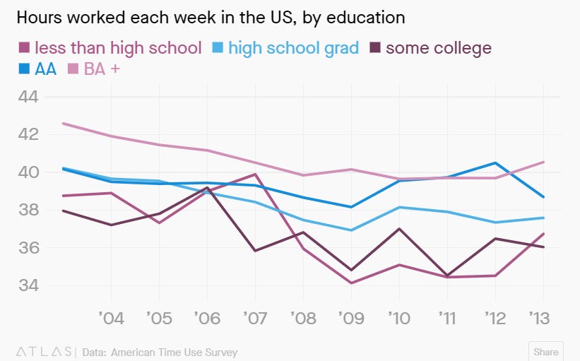 Economists often credit decreases in working hours as a factor that has widened inequality. However, they often remain stumped at why people may work less, especially in services work. Assumptions in many economic models assume that “homo economicus” wants to buy more stuff or have more leisure, but tend to downplay or ignore the leisure part. This Quartz article is typical of this line of thinking: