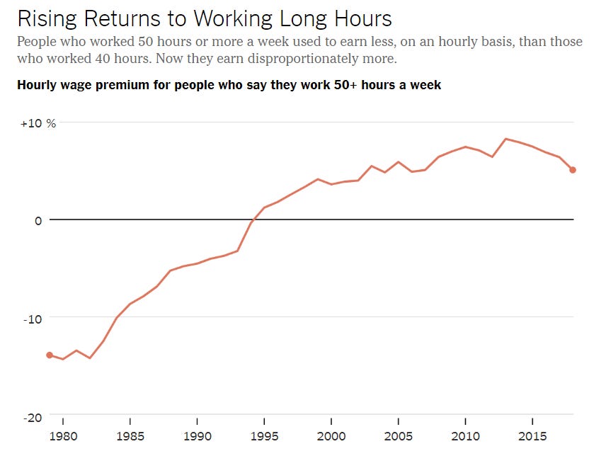 This article highlights a trend I talked about last week, that in the highest paid jobs - this article calls them the “greedy professions” (consulting, law, banking, ) - the returns to longer hours are often disproportionate to the excess hours. About 25 years ago, longer hours became something you got paid a premium to do.