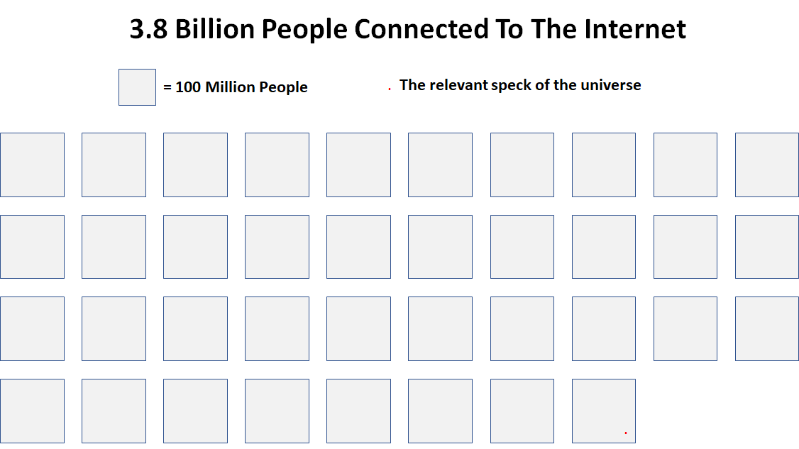 If you squint, you can find your relevant speck of the universe you need to tap into. If you are working as a freelance consultant, you likely need no more than 5-10 steady clients to support your life for the next 5-10 years. If you are selling a course for $200 and want to earn $100,000 a year, you only need to worry about finding 500 people who are excited about what you are creating.