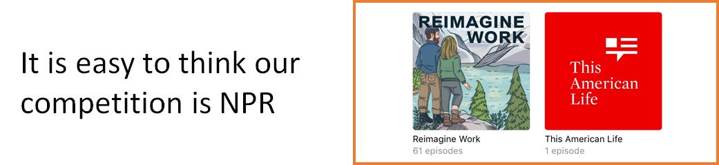 I talk to many people who have been stuck for years. They want to explore pursuing a solopreneur path or something similar but feel that they will be a failure. If they are a consultant worried about competing with McKinsey that will happen, if they are starting a podcast thinking about competing with NPR that will happen too.