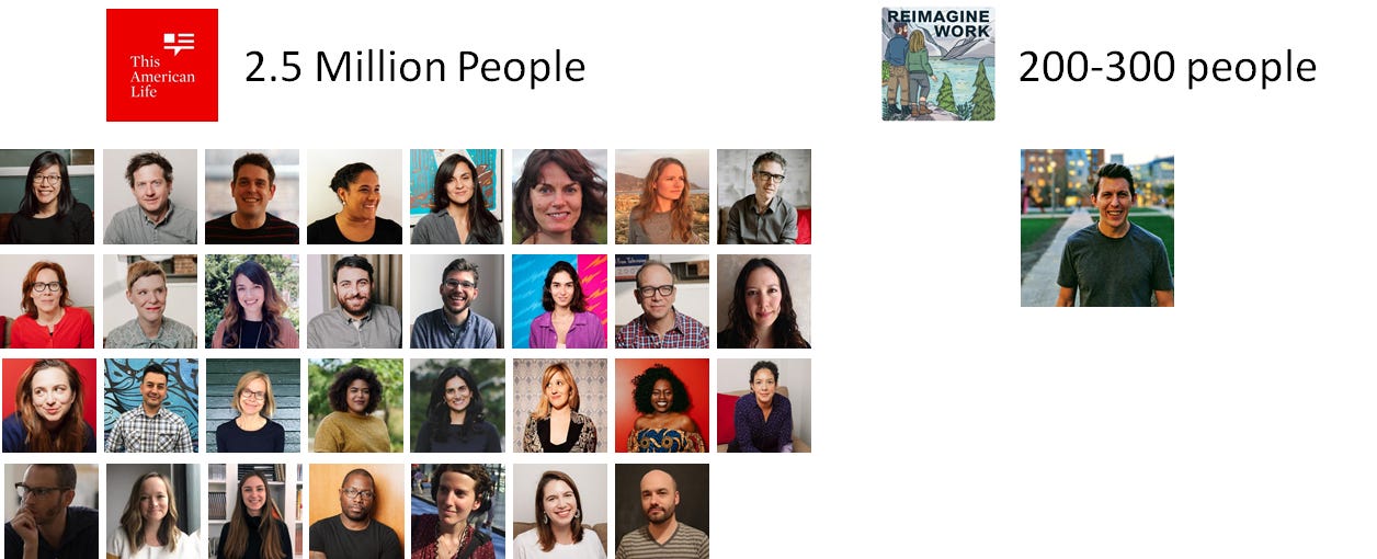 This American Life is only one of NPR’s many podcasts. They have a whole damn team working on just this podcast. Let’s take a look at their team compared to mine and the number of listeners.
