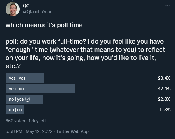 It’s a small sample size but an incredibly strong signal and maps to what I hear from people in my conversations. His poll showed a large majority of people employed full-time felt like they lacked the time to reflect on their lives and in contrast, two of every three people not fully employed did feel like they had sufficient time to reflect on their life.
