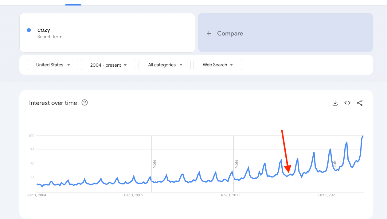 Venkatesh Rao has unleashed dozens of terms into the internet ether including terms like waldenponding, the Gervais Principle, premium mediocre, and one he coined in 2019, “domestic cozy.” The red arrow is when he wrote the post: