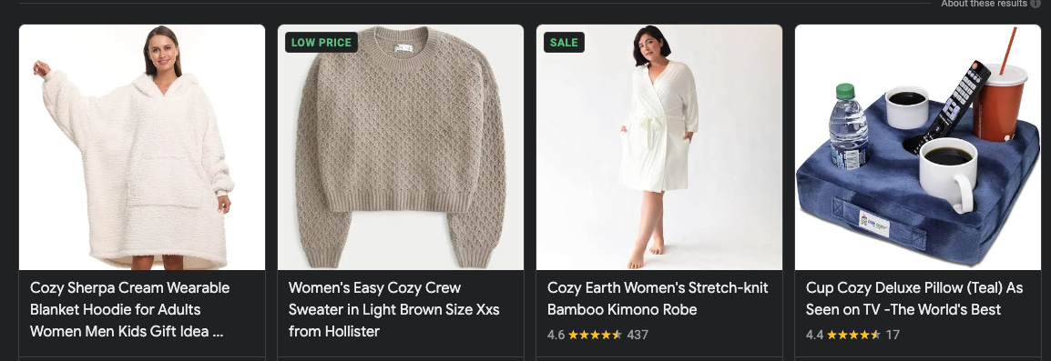 I’ve recently started seeing the term “cozy” being appended to all sorts of situations where it had not been before. Now is this due to Rao? I have no idea. I do know that he has tons of influential followers and if you do a bit of searching you see news articles citing “domestic cozy” in 2020 and beyond, including a Vox article, titled, “Why are so many brands pivoting to Coziness?”