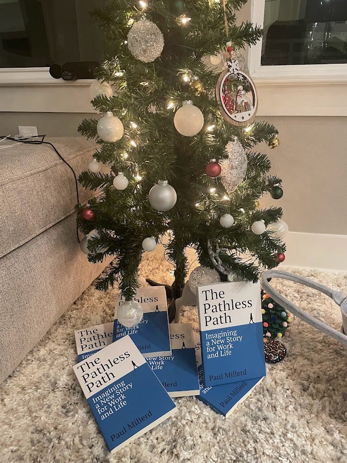 The “pathless path” was different. It was not a phrase original to me either but something I repurposed from the spiritual domain to describe what I saw as a helpful frame for thinking about work. I took the idea from Ram Dass via David Whyte and have been using it in conversation and writing since 2018. I noticed that people LOVED the term when I used it to describe what I was up to. Angie loved it so much that she made us a journal with a quote about the pathless path on the cover when we got married. By the time it came to use it for my book name, it was a no-brainer. I liked it and I had seen people’s eyes light up or freak out saying “That is so good!” hundreds of times when I shared it in one-on-one conversations.