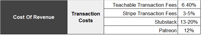 Cost of Revenue (Mostly Stripe) ~ 3-20%