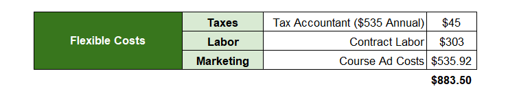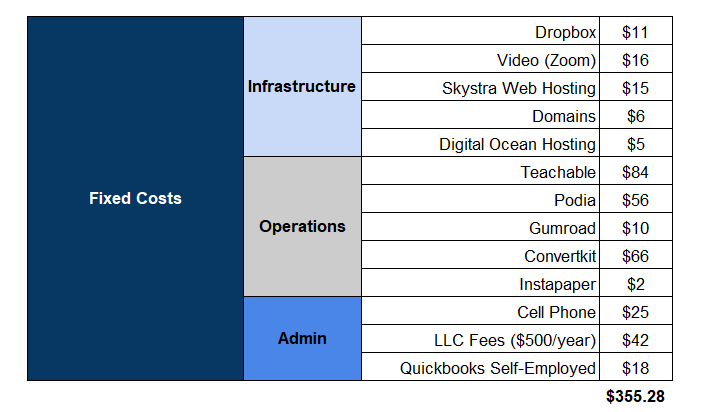 These include things like web hosting, accounting, course platform fees, file storage, Zoom, cell phone and LLC fees. Most of these are necessary to run my business and I can’t really scale them up or down.