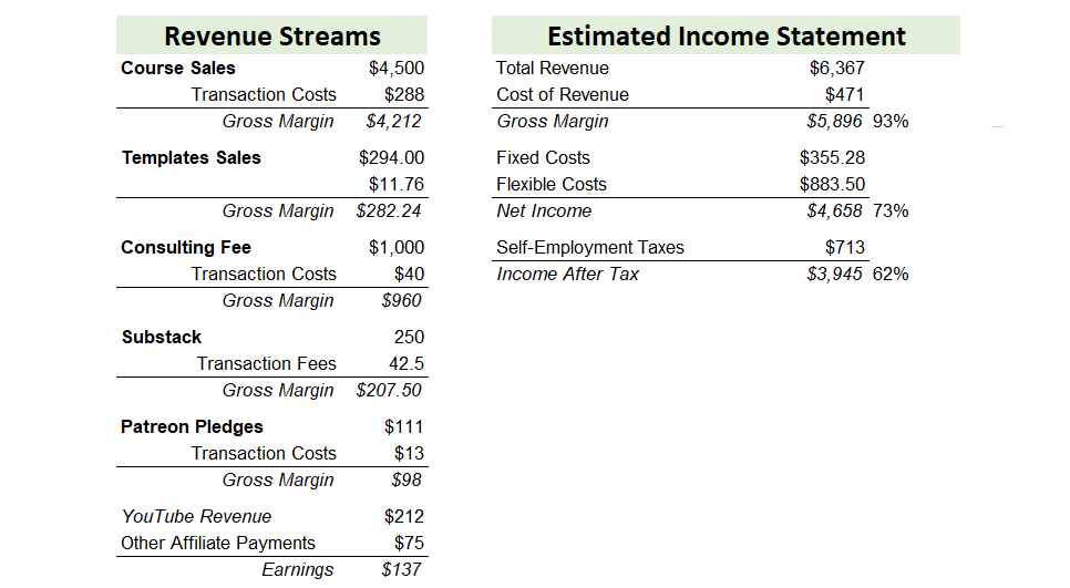 I put together some example income streams I might see in a typical month (as my business stands right now) and what that means for costs and profit.