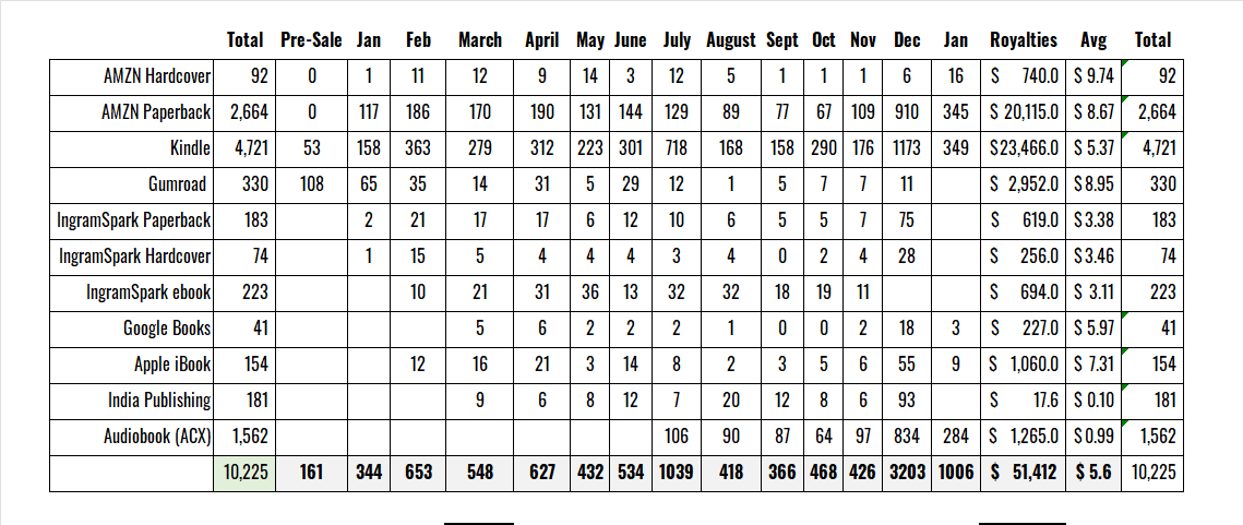 The costs include editing, publishing, design, platform fees, some ad spend on Amazon, a couple of consultants that helped me think about the book, and gifting anyone who asks for my book, which is close to over 1,000 at this point.