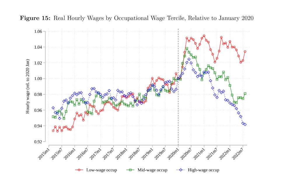 Some interesting new research from David Autor from MIT (one of the best work economists) shows that wages for lower-income workers rose fasted from 2019: