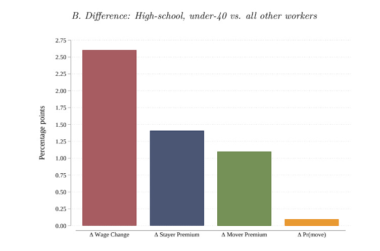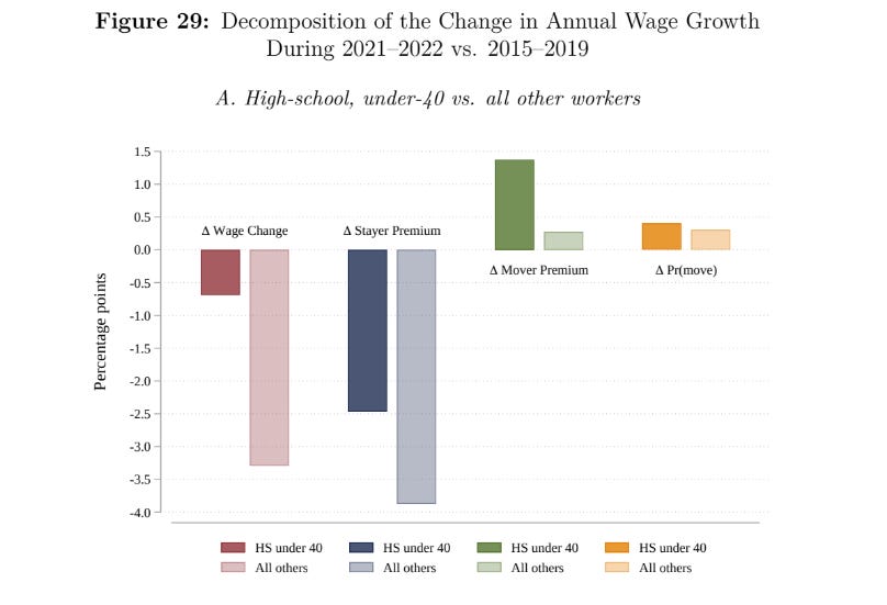 The paper also highlights that people are moving between jobs and between industries more often driving some of the wage increases. The below chart is a little confusing but if you look at the dark bars, those are HS-educated workers under 40, who saw less wage compression, less of a hit of staying in a job, and more benefit to changing jobs.