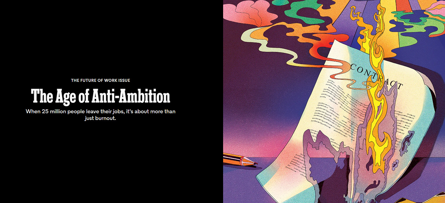 Last year, the New York Times Magazine posted an article titled “The Age of Anti-ambition.” They were riding a collective panic around people not wanting to work, something that looking back, looks like a labor market aberration coming out of Covid, just as I was trying to say it was.