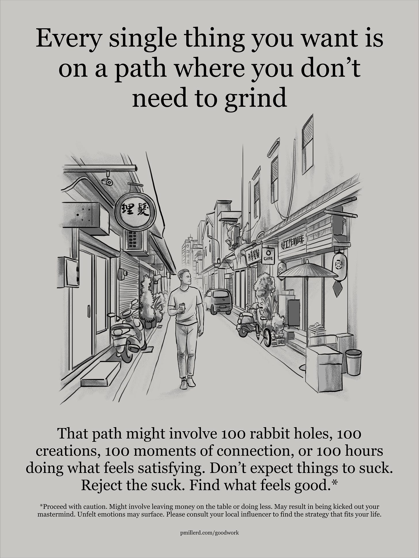 Someone said it was a “dangerous idea.” Another person argued that I was just sharing that sentiment after “extreme success” (please show me the riches lol). One more said that it should come with a “warning label.” They argued that 999 out of 1000 people would likely have to grind and suffer, and I was the 1 person who somehow broke free from this predicament, and that telling people that they should consider work doesn’t have to suck could ruin someone’s life. In that scenario, someone would theoretically be consuming a post by Paul Millerd, then decide that doing things they enjoyed was a good thing to consider, and then next thing you know, their life is in shambles.