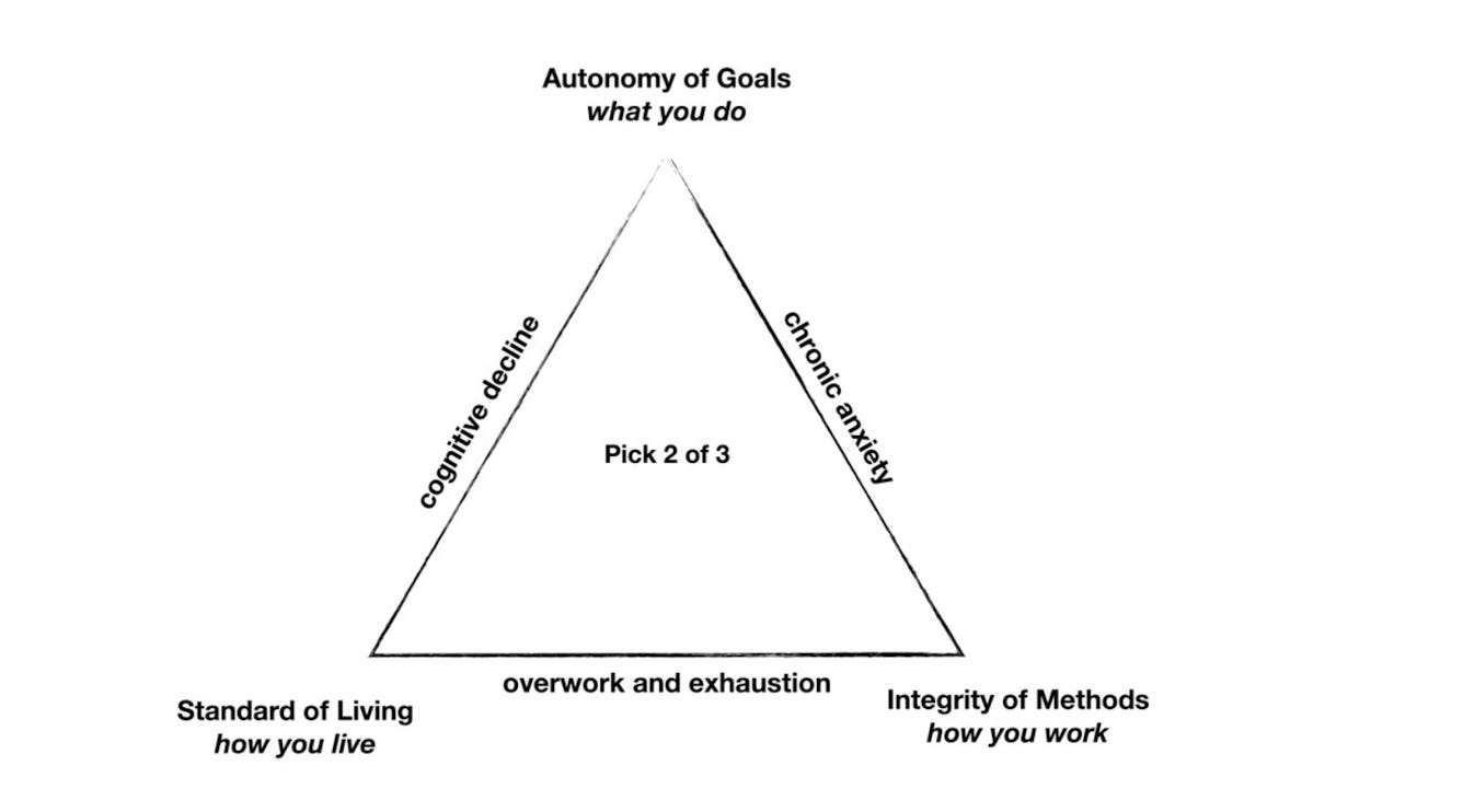 I like the triangle framework because it forces hard trade-offs. If you choose to optimize for how you work and what you do, you’re likely going to face financial challenges.