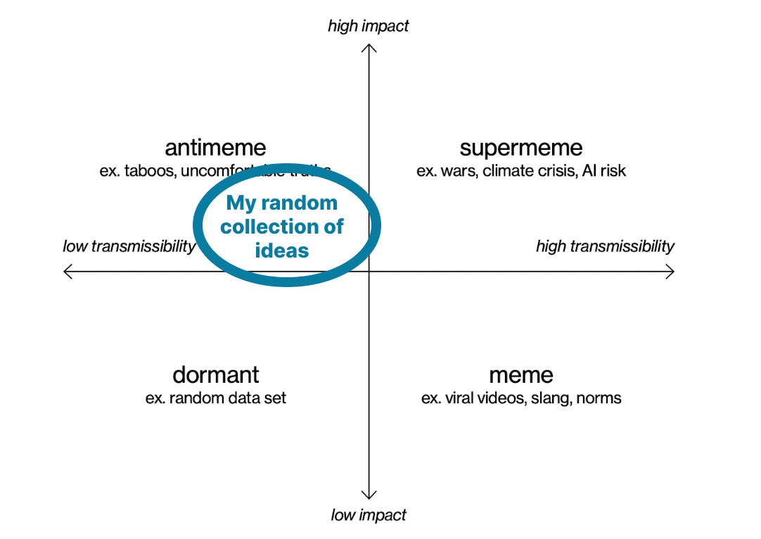 I was doing some reflection on these tendencies I have and realizing it could be a fun additional chapter to add to Nadia’s book: Are you memetic or antimemetic? Some people in the online writing and creator worlds will do anything to spread their ideas. I’m not wired like that, and those people are like aliens to me. But given how many platforms have underlying memetic principles, this is something worth reflecting on.