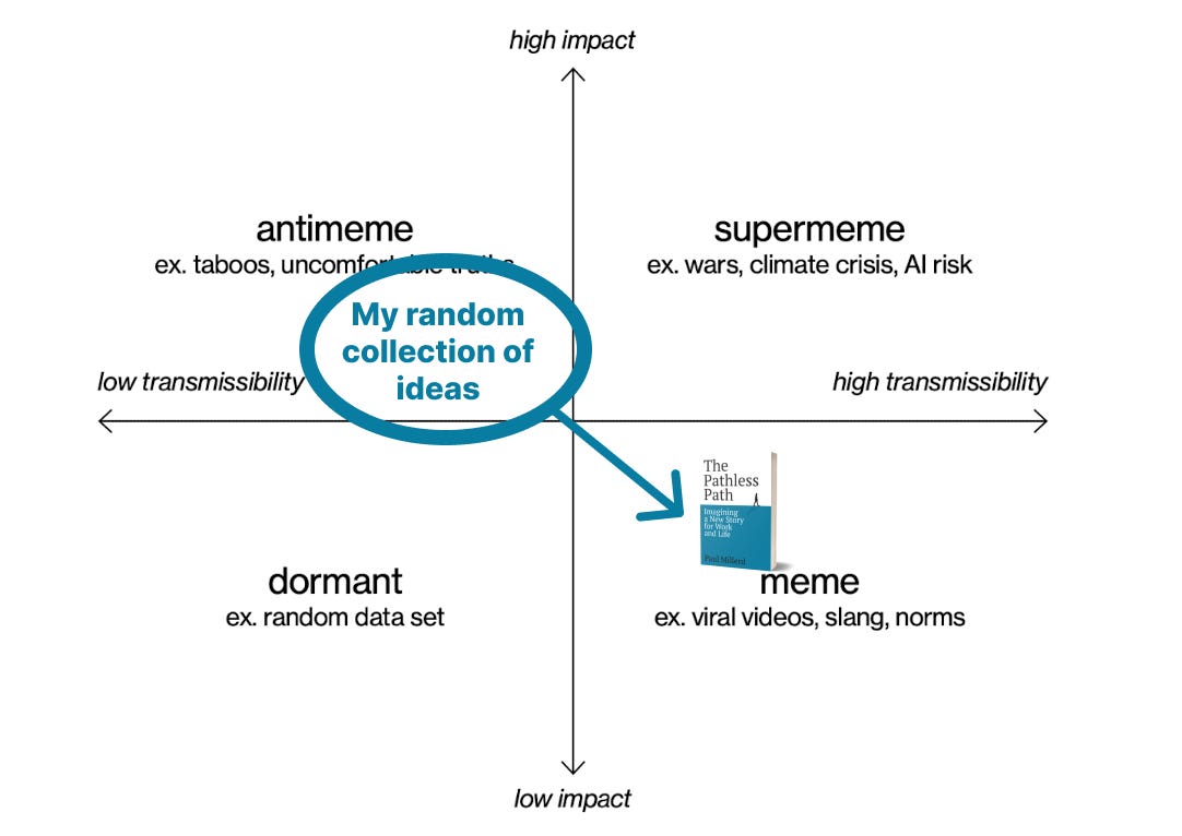 The ideas that made it into The Pathless Path require energy and effort to make sense of. To many people who never think about work too much, my ideas are annoying as hell. They are mood killers. I am the guy who asks big questions. A lot of people hate this. So my ideas won’t spread with those people. But to a certain kind of person already asking the questions I am asking, the packaging of the phrase “the pathless path” and an optimistic framing of embracing an unconventional path did spread.