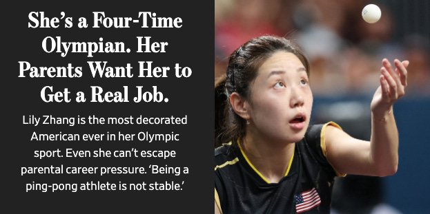At age 16, she competed at the 2012 London Games. Though she lost her first match, her parents declared it a resounding victory. “They’re like, OK, you got the Olympics, you got that on your college apps and now you can focus on studies,’ " Zhang says.