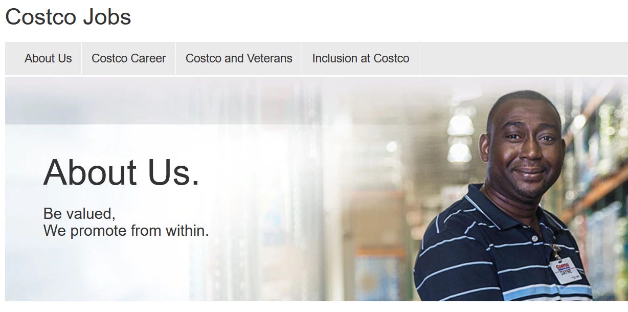 I lied. 98 out of 100 were bad. I thought Costco’s career page was great mostly for one line, “be valued. promote from within.” This is pretty much all that’s on the page. There isn’t any fluff or promises of “meaningful work” or life transformation. I’ve studied Costco in-depth and these two lines are exactly what they are known for and follow through on in their culture.