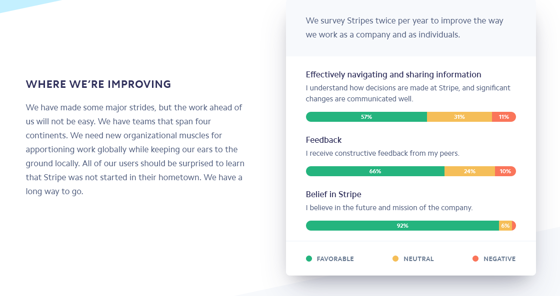 Though Stripe throws a nice #humblebrag (92% believe in mission) out there it also shows it struggles with sharing information.