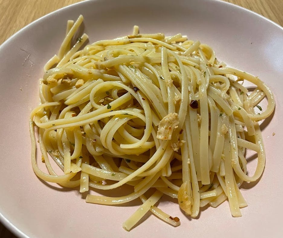 I’ve now cooked an olive oil and garlic pasta dish four times and each time I learned a little more about heat, ingredients, the magic of butter, and using pasta water. By the fourth, I even had enough confidence to go for the white wine clam version. Looks pretty cool on our cute pink bowl plates, huh?