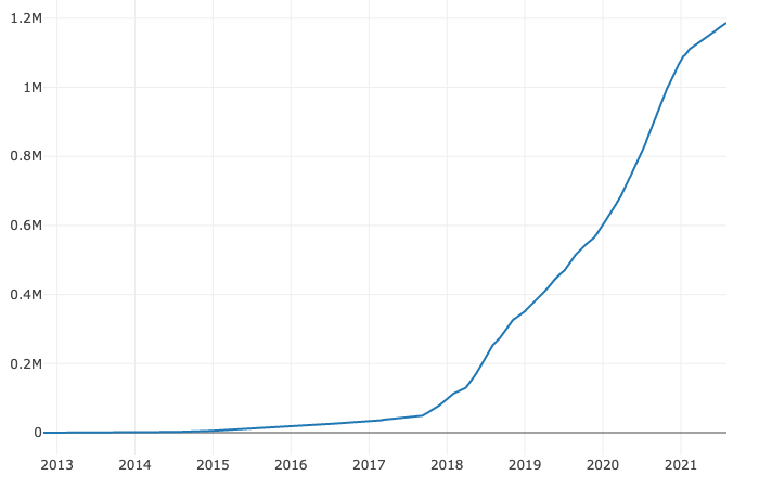 Nomads definitely came together as a community on the internet and built their own culture online. Just look at the growth of the r/DigitalNomad community on Reddit – from 43 members in 2012 to more than 1.1 million members in 2021: