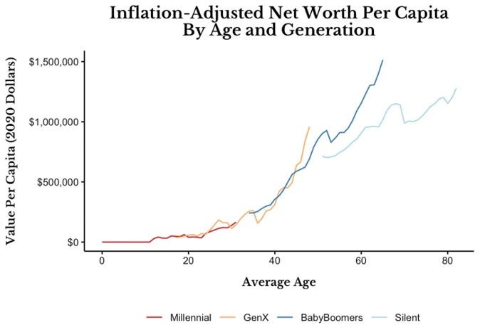 This is the point that Nick Maggiulli made in his recent deep dive into these trends. He was skeptical of much of the news and data around the current generations struggles so went to see what he could find5. When he adjusted wealth for household size and inflation he found that things are pretty similar to previous generations.