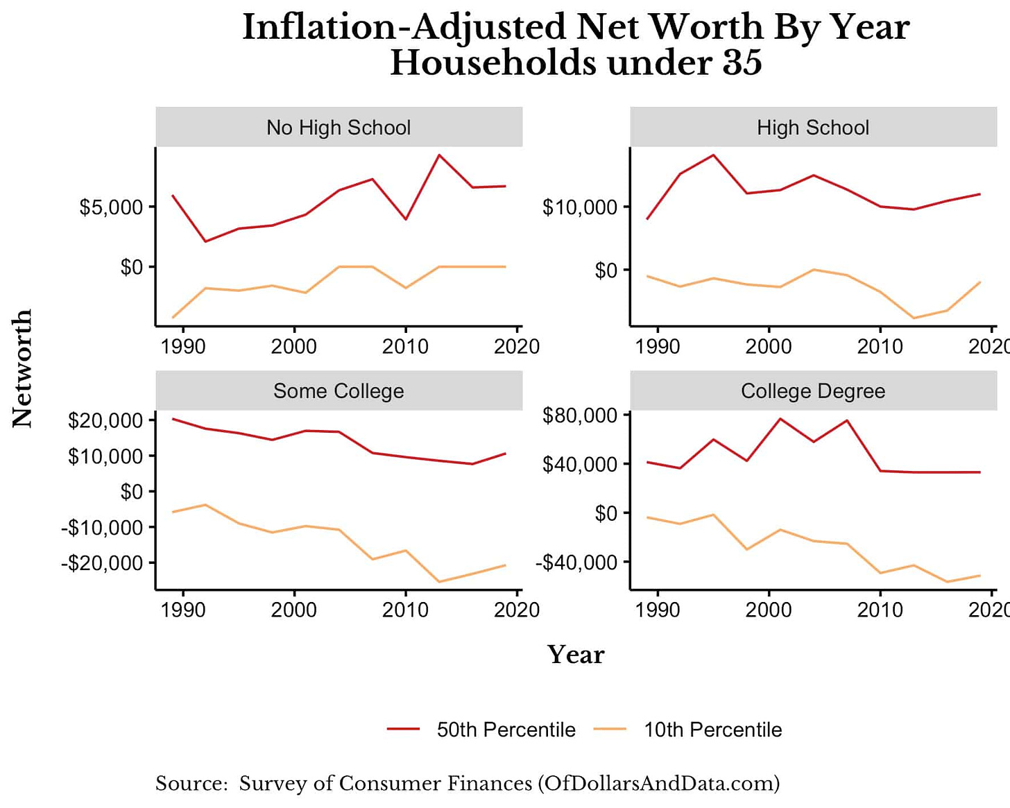 in addition, a decet percentage of the millennial generation are much worse off than previous generations. This is due to taking out a lot more debt earlier due to the exploding costs of college. If you look at the adjusted net worth by income percentile and degree status, you find that the 10th ad 50th percentile millennials with some college experience are deep in the hole.