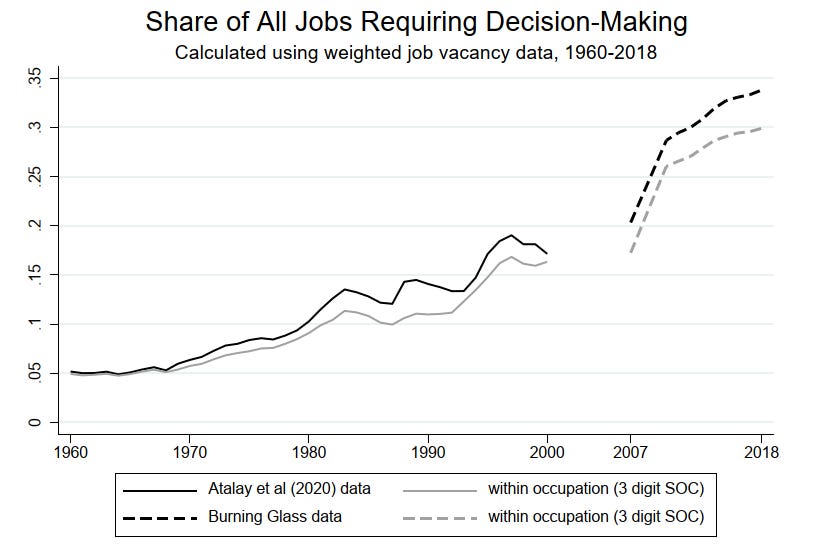 He found this trend across the entire economy even after removing all management professions and that decision making intensity was increasing within jobs rather than simply a change in the makeup of the jobs.