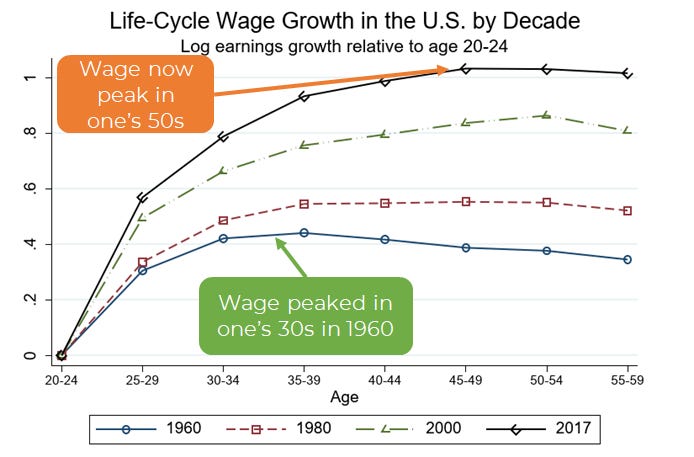 Deming found that in the 1960s lifetime wages peaked sometime in a person’s early 30s. Now one’s earning are likely to jump a lot more earlier in one’s career and also continue to rise until one’s 50s or 60s.