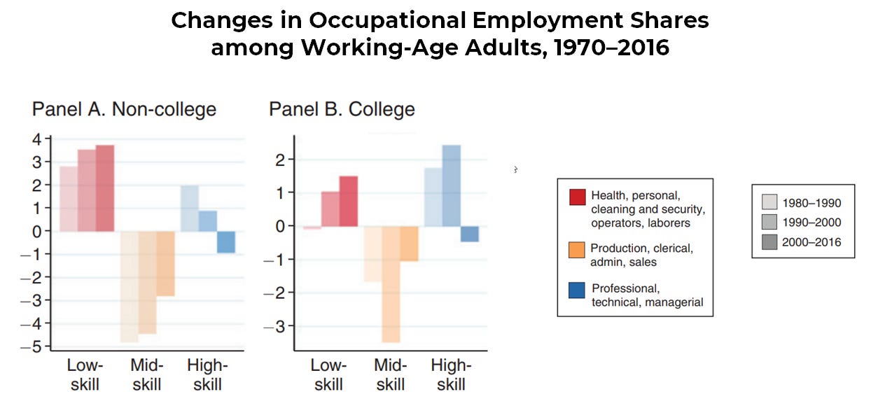 If step back and look at the last forty years we see that the jobs that exist have been shifting in two directions. This is due to the disappearance of “middle-skill” jobs which MIT Economist David Autor has detailed in his research2. These were the jobs at the center of the “great boom,” the 1945-1980 period that helped solidify our belief in a stable, corporate job as the key to a middle-class life.
