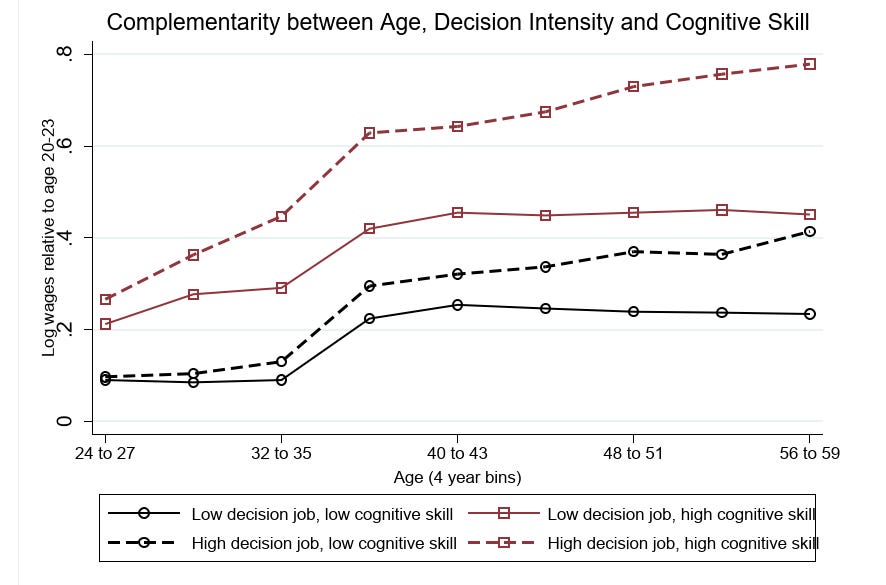 When he broke down this trend by degree of decision makign and cognitive skills, he found that this trend was most pronounced in “high-decision, high coginitive skill” jobs.