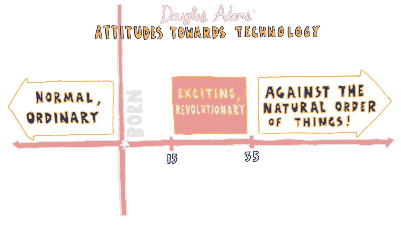 Anything that is in the world when you’re born is normal and ordinary and is just a natural part of the way the world works. Anything that's invented between when you’re fifteen and thirty-five is new and exciting and revolutionary and you can probably get a career in it. Anything invented after you're thirty-five is against the natural order of things.”